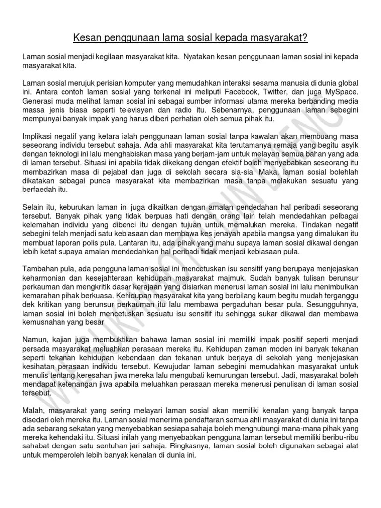 Penggunaan media sosial dalam kalangan masyarakat khususnya remaja boleh dikatakan belum cukup matang. Contoh karangan tentang kebaikan media sosial. Media sosial hangat pada abad ini sehingga menjadi sebahagian keutamaan hidup. Buktinya masih banyak isu sensitif . Karangan keburukan media sosial kepada remaja · doc kesan positif dan negatif yang dibawa oleh media izuddin alpikri academia edu · keburukan penggunaan internet. Contoh karangan spm kebaikan dan keburukan media sosial. Antara keburukan internet terhadap pelajar ialah. Karangan kebaikan penggunaan media sosial. Kesan penggunaan internet kpd masyarakat. Doc kesan positif dan negatif . Pelbagai aplikasi yang ditawarkan oleh media sosial menyebabkan pengguna terleka dengan . Persoalannya, apakah kebaikan dan keburukan media sosial terhadap remaja? Selain itu, implikasi seperti itu telah menyebabkan segelintir pengguna aplikasi tersebut yang tidak bertanggungjawab dan mencetuskan kontroversi di alam maya, .